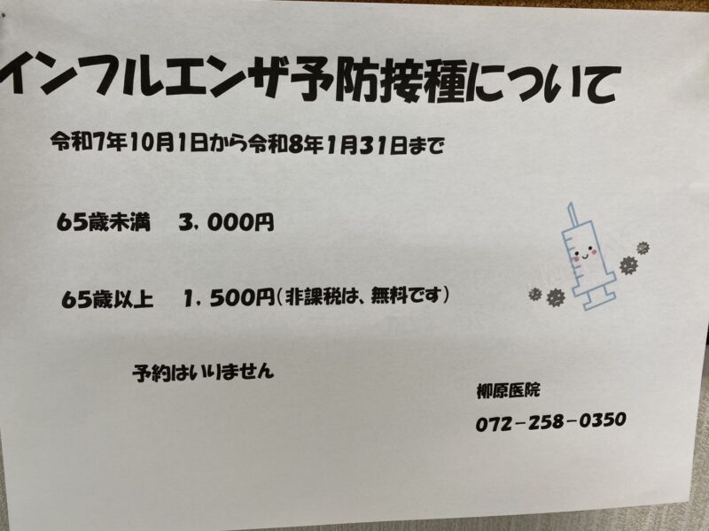 インフルエンザ予防接種を令和7年10月1日より行います。 予約はいりません。接種料金は上記の通りです。 体調の良い時にいらしてください。