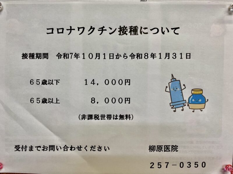 コロナワクチン予防接種を令和7年10月1日より行います。接種料金は上記の通りです。非課税世帯は無料になっています。窓口に問い合わせをお願い致します。